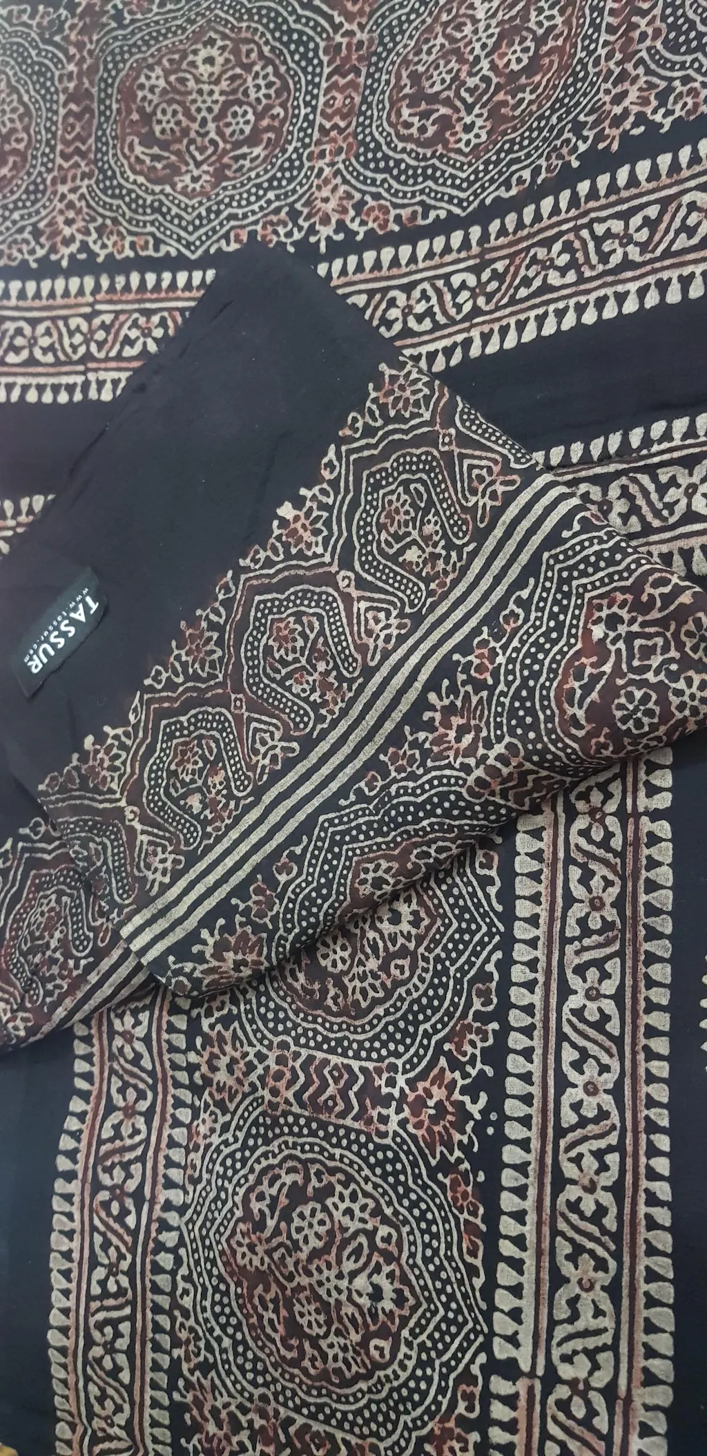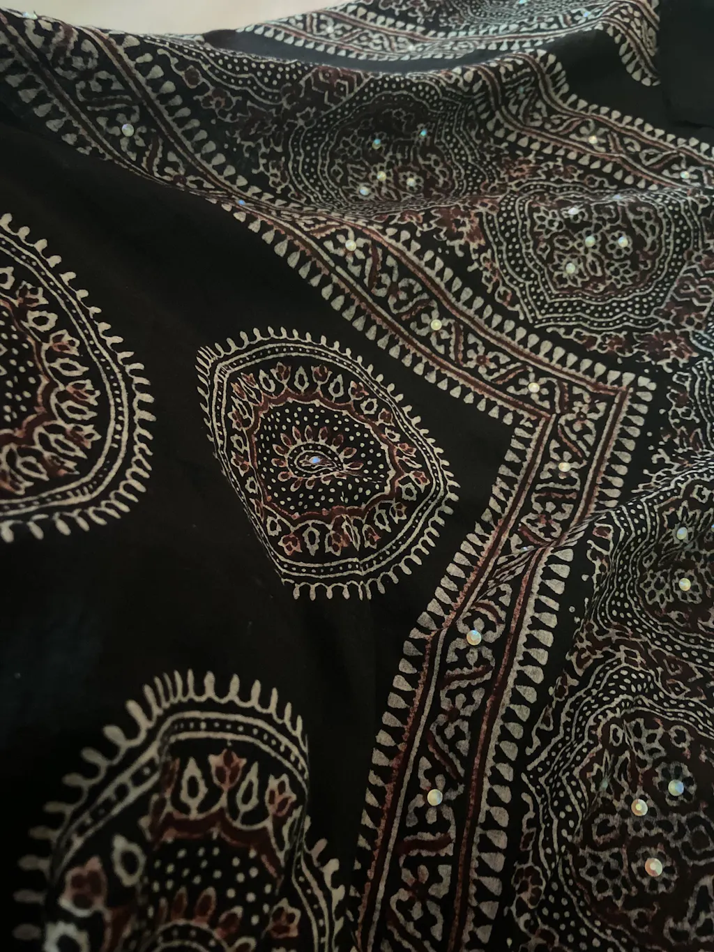 Ajrak chaadar/shawl hand block printed with natural dyes, enhanced with studs. Product is handcrafted and chemical free, 100% organic.